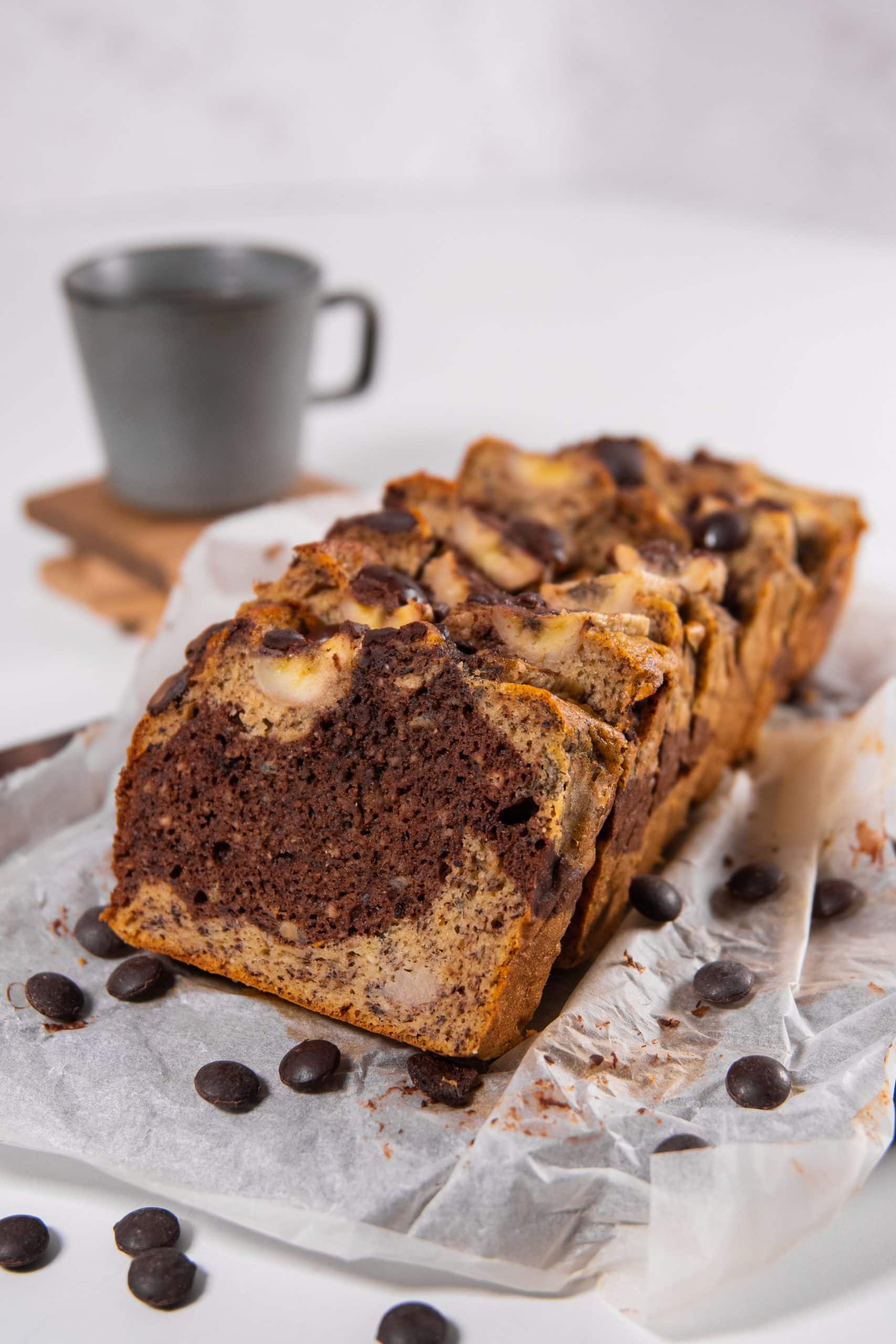 - Werk af met chocoladedruppels en in de lengte gehalveerde banaan die je bovenop het beslag legt.